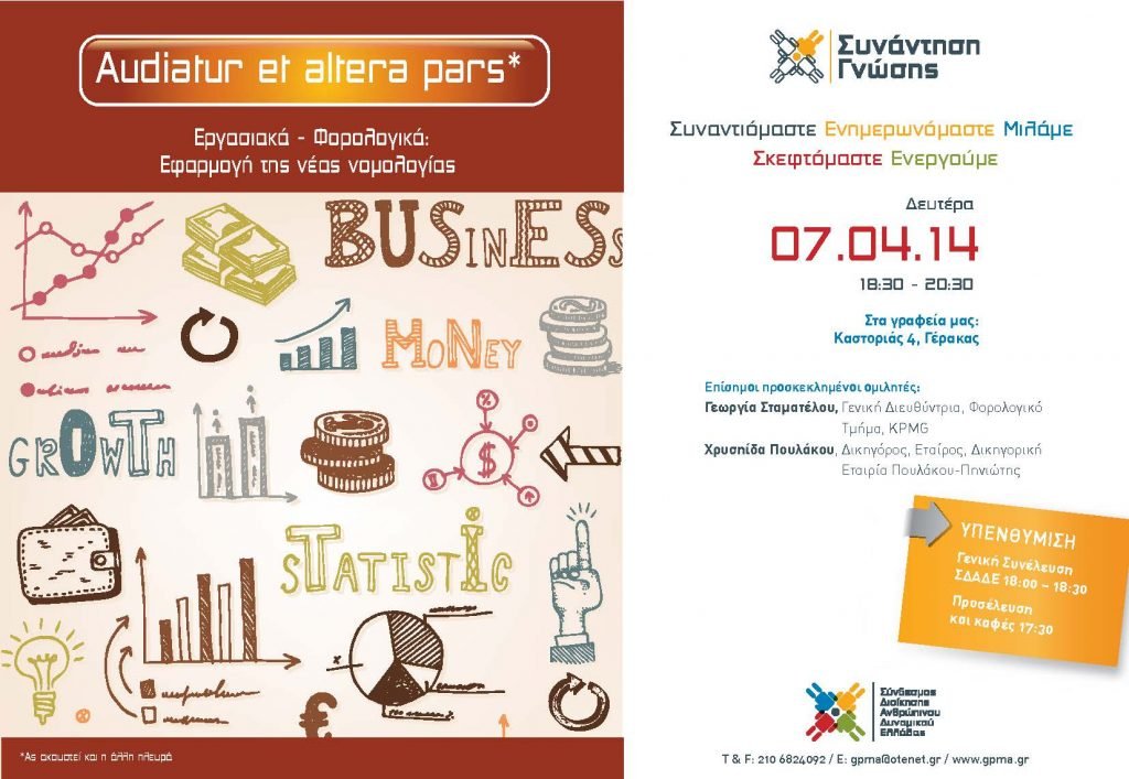Πρόσκληση για τα Τακτικά Μέλη του ΣΔΑΔΕ στη Συνάντηση Γνώσης με θέμα «Εργασιακά – Φορολογικά: Εφαρμογή της νέας νομολογίας» τη Δευτέρα 7 Απριλίου 2014, 18:30 – 20:30, στα γραφεία του ΣΔΑΔΕ.