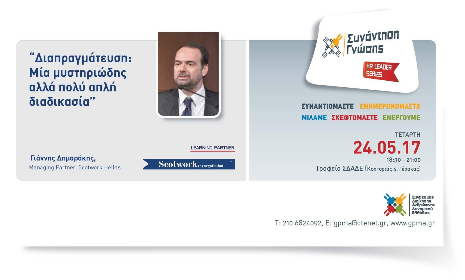 Έτσι η συνάντηση αυτή διοργανώνεται πάλι με Learning Partner την εταιρία Scotwork Hellas και εισηγητή τον κο Γιάννη Δημαράκη, Managing Partner της εταιρίας, τo απόγευμα της Τετάρτης 24 Μαΐου 2017 και ώρα 18.30-21.00.