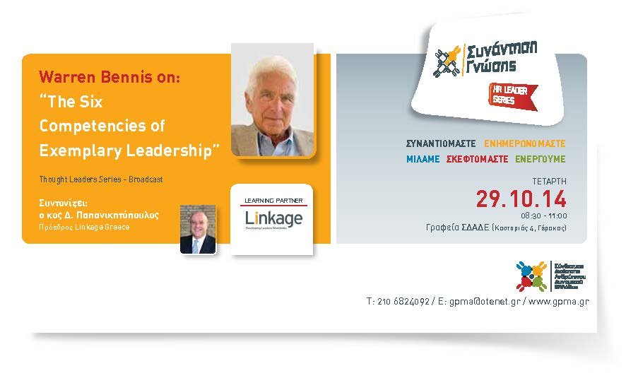 Η συνάντηση θα πραγματοποιηθεί την Τετάρτη 29 Οκτωβρίου (αντί της αρχικά προγραμματισμένης για τις 15 Οκτωβρίου), 8:30-11:00, με θέμα «The Six Competencies of Exemplary Leadership», με τον Dr. Warren Bennis, broadcast, και τον κο Δ. Παπανικητόπουλο, Πρόεδρο της εταιρίας Linkage στο ρόλο του συντονιστή.