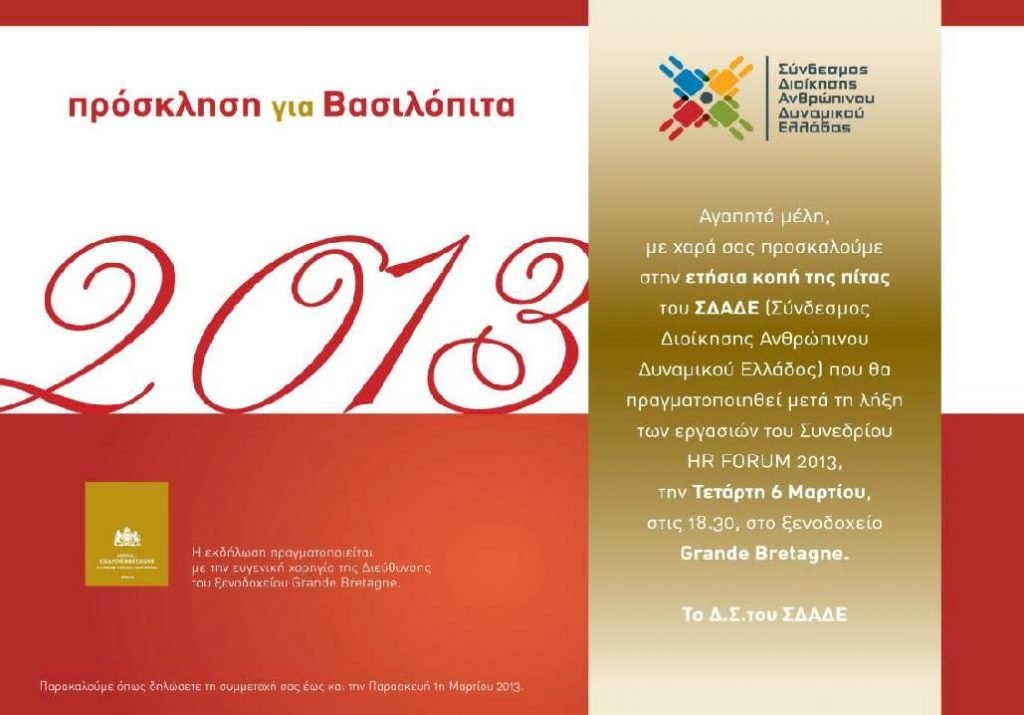 Αγαπητά μέλη, με χαρά σας προσκαλούμε στην ετήσια κοπή της πίτας του ΣΔΑΔΕ (Σύνδεσμος Διοίκησης Ανθρώπινου Δυναμικού Ελλάδος) που θα πραγματοποιηθεί μετά τη λήξη των εργασιών του συνεδρίου HR FORUM 2013, την Τετάρτη 6 Μαρτίου στις 18:30 στο ξενοδοχείο Grande Bretagne.