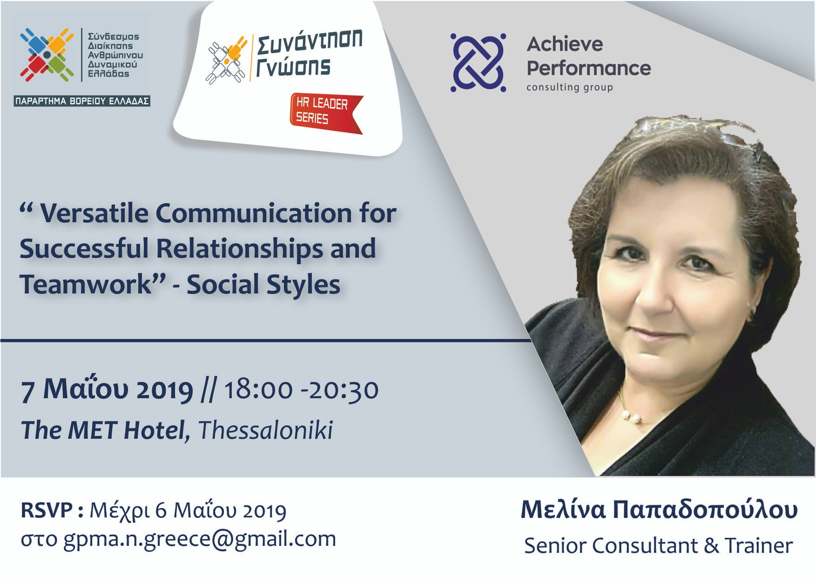 Στο πλαίσιο των Συναντήσεων Γνώσης προγραμματίζουμε την Τρίτη 7 Μαϊου 2019 και ώρα 18:00 -20:30, (ώρα προσέλευσης 17:30) στο ξενοδοχείο The MET, εκδήλωση με θέμα: “Versatile Communication for Successful Relationships and Teamwork” – SOCIAL STYLE®, με εισηγήτρια την κα Μελίνα Παπαδοπούλου, Senior Consultant & Trainer στην Achieve Performance Consulting Group.