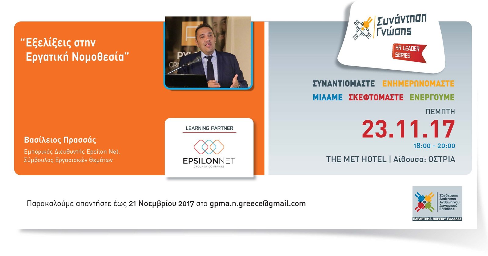 Στο πλαίσιο των Συναντήσεων Γνώσης προγραμματίζουμε την Πέμπτη 23 Νοεμβρίου 2017 και ώρα 18:00-20:00, στην Αίθουσα ΟΣΤΡΙΑ του ΜΕΤ Hotel, ενημερωτική εκδήλωση με θέμα “Εξελίξεις στην Εργατική Νομοθεσία” με την εισήγηση του κου Βασίλειου Πρασσά, Εμπορικού Διευθυντή της EPSILON NET & & Σύμβουλο Εργασιακών Θεμάτων.